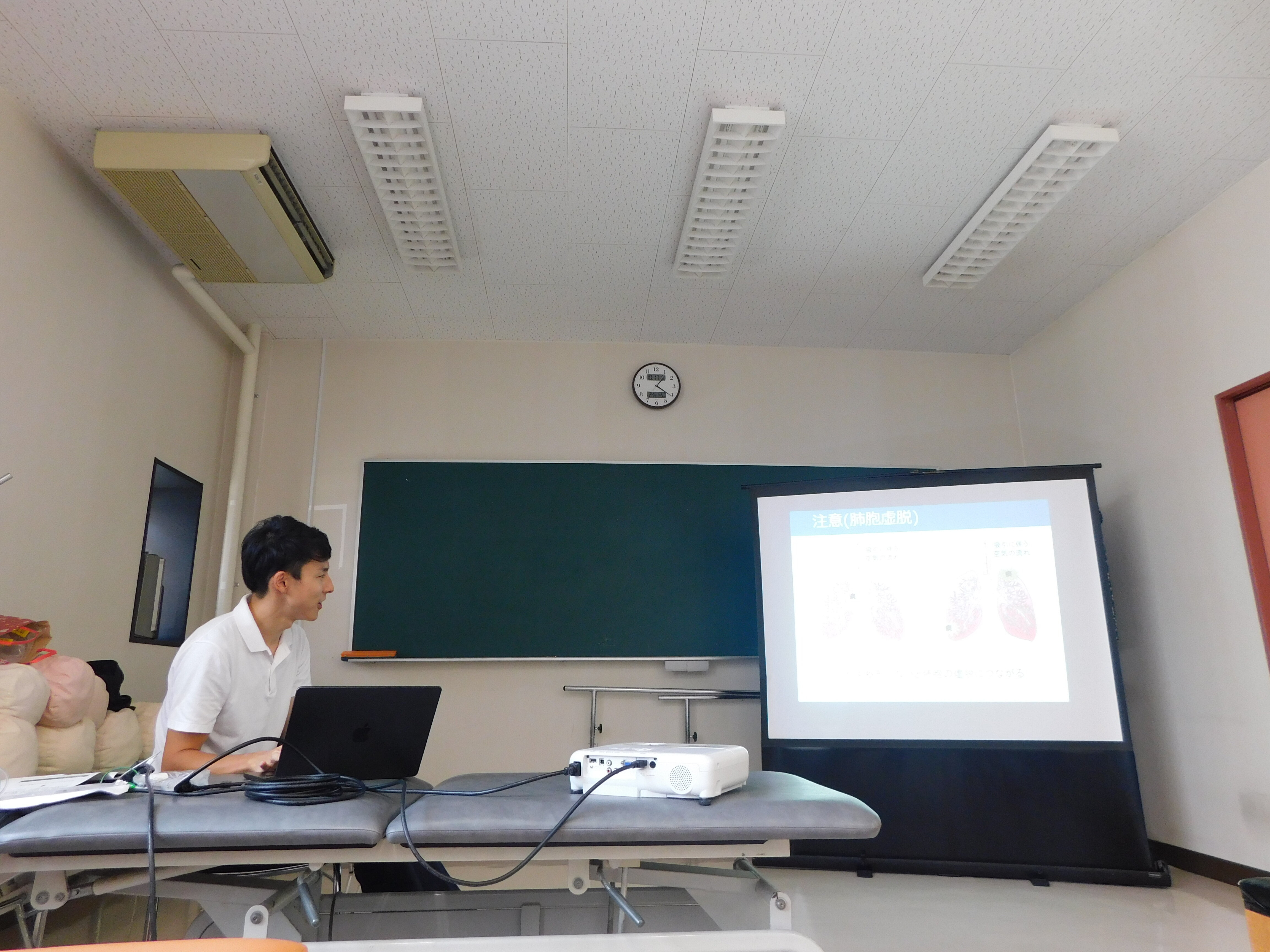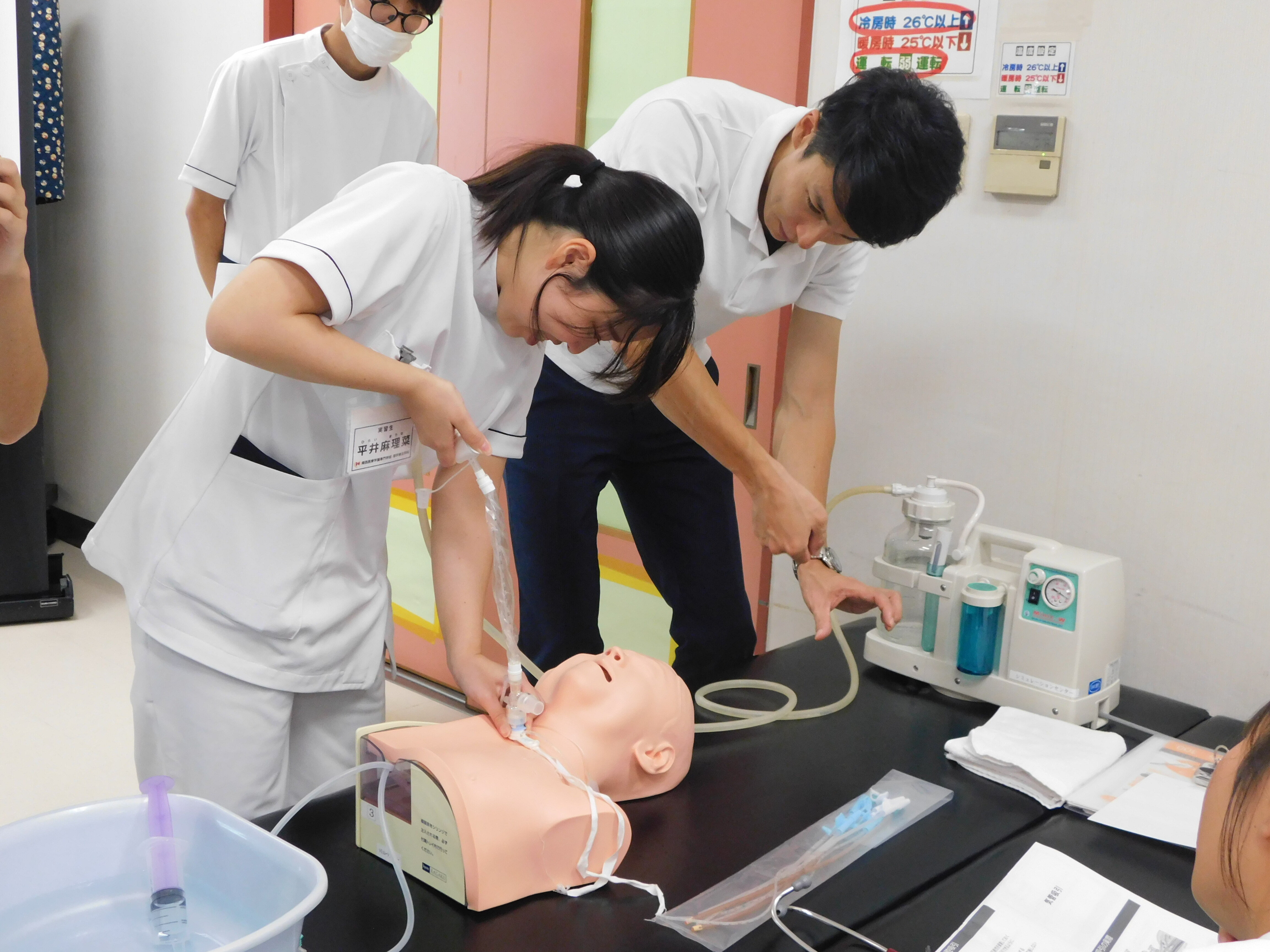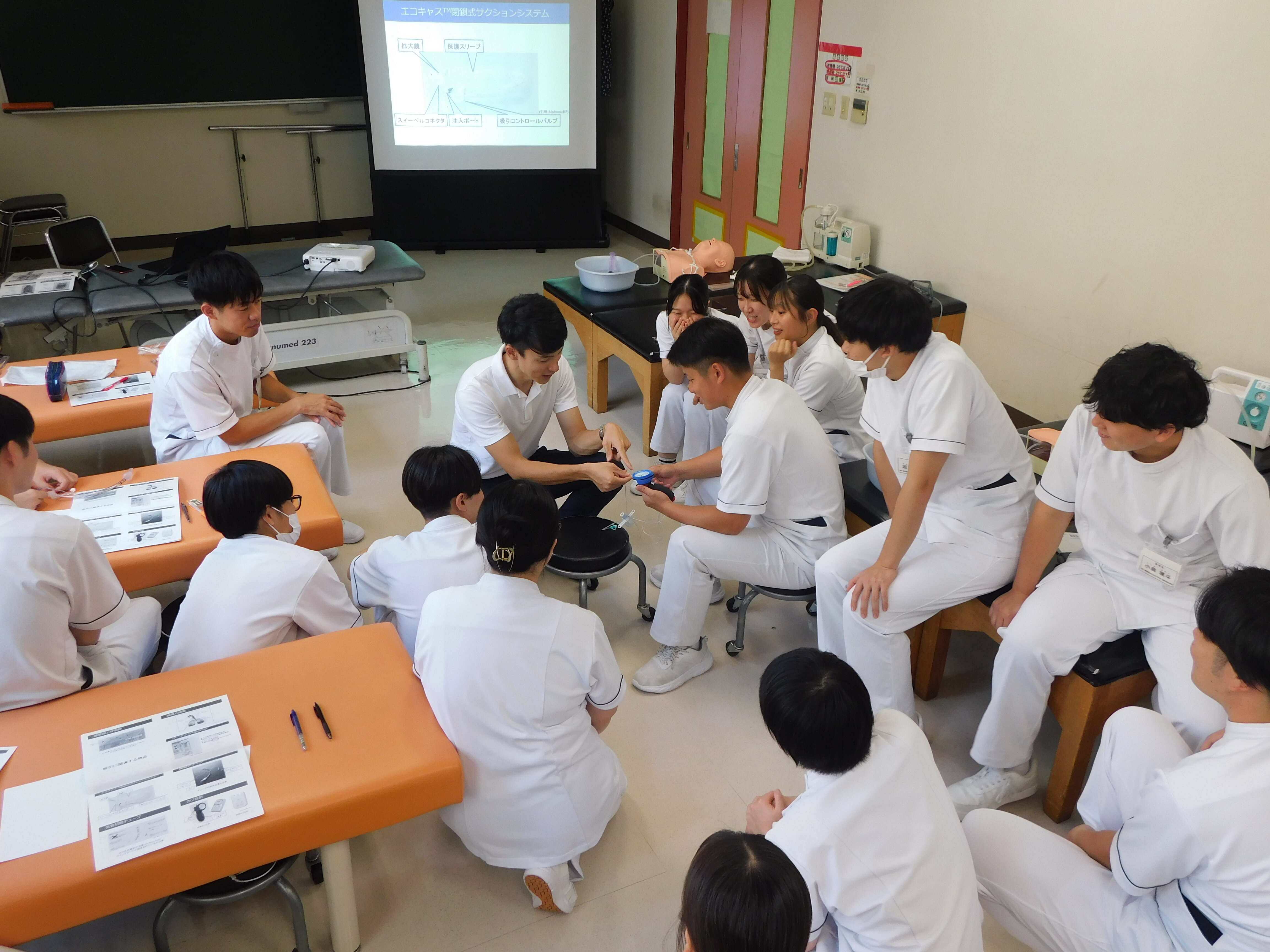 2010年から理学療法士が吸引手技を行うことが合法化されています。講師の先生は他職種に対して現場で講義をされており、臨床的な話も聞けて学生さんも興味津々です。講義の中で実際に数種類の器具を使用して吸引手技について経験してもらいました。