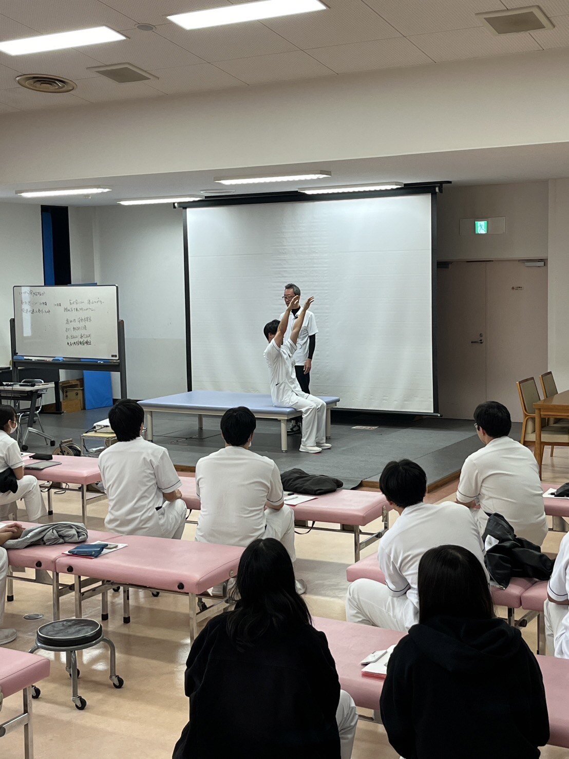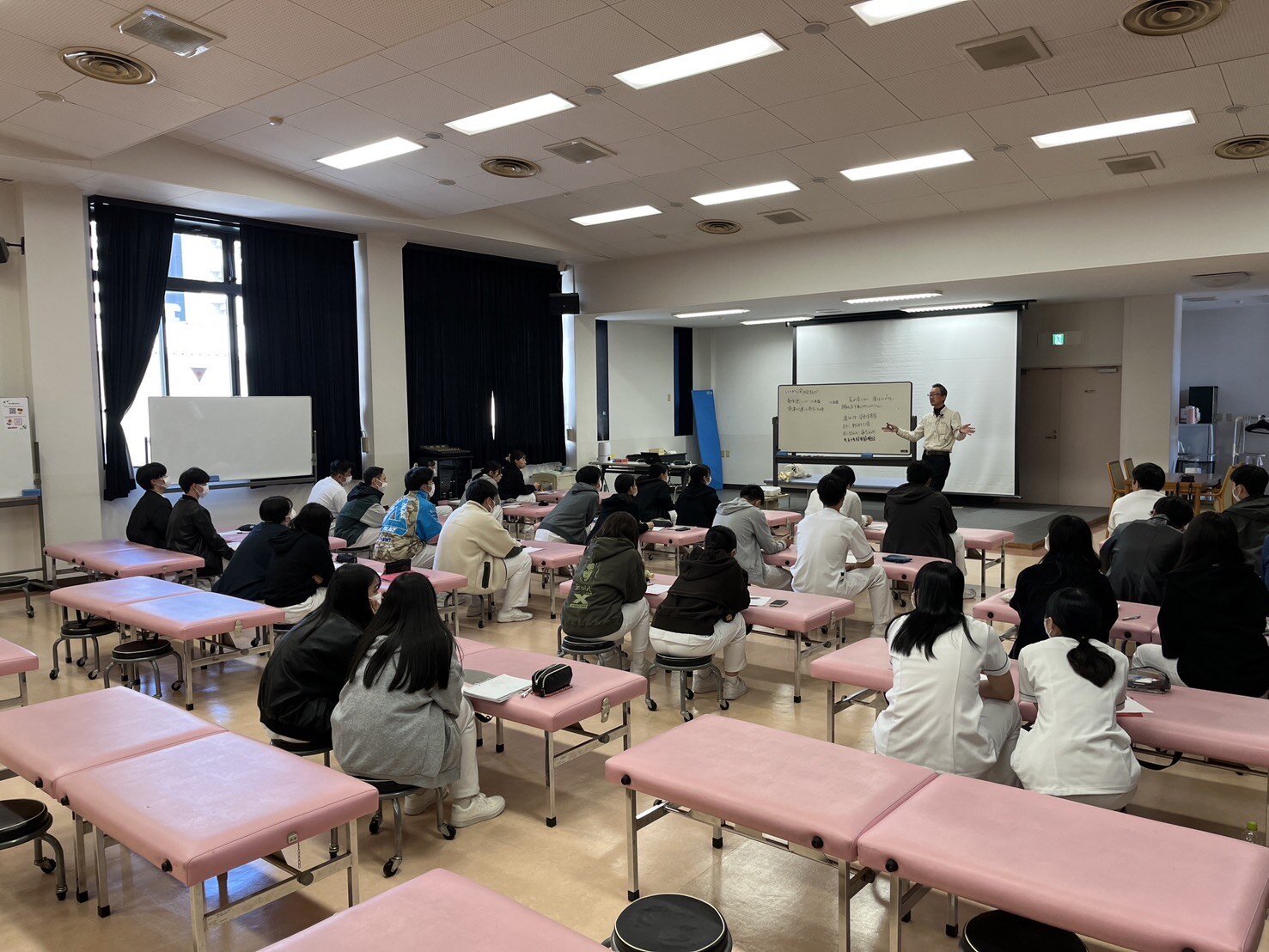 治療に結び付くための患者様の評価は何を行うか、その評価で出来る出来ないかを見て、何を考えていかないといけないのか。様々な観点から学生達に問いかけ、そして学生達からの意見・考えを聴きながら講義を進めてくださりました。