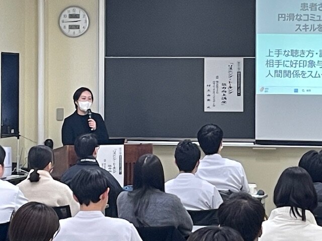 リスニング・トーキング能力向上講座開講! 非常にわかりやすく説明くださいました。 みんなでワーク中! トップページ2026年2月 4日 リスニング・トーキング能力向上講座を受講しました。 本日、理学療法学科2年生が「リスニング・トーキング能力向上講座」を受講しました。講師に株式会社マイナビ関西メディカルキャリアサポート課の村上由実氏をお迎えし、ケーススタディやワークも交えながら、特に臨床実習に出る学生さんに必要な会話のテクニックなどを学びました。2週間後に臨床実習を控える2年生にとっては、とても有意義な時間であったと思います。
